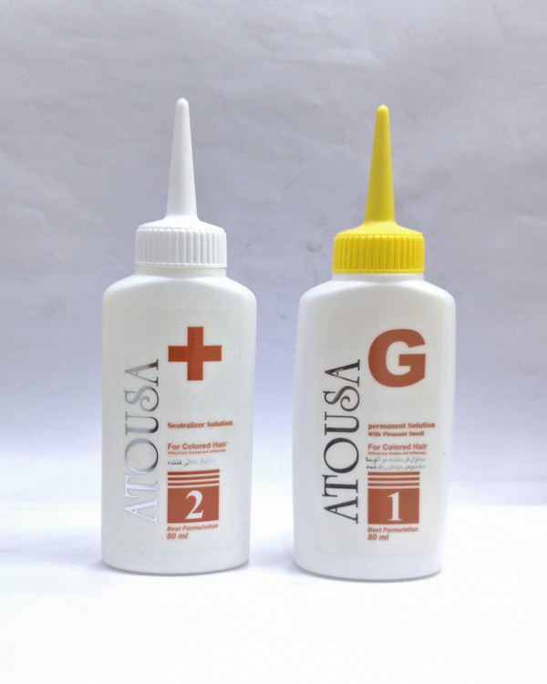 - 2/3 محلول خنسی سازی را بعد از تکان دادن بر روی موهای پیچیده شده بمالید و 10 دقیقه صبر کنید .